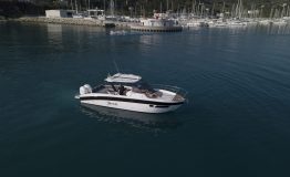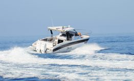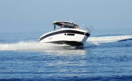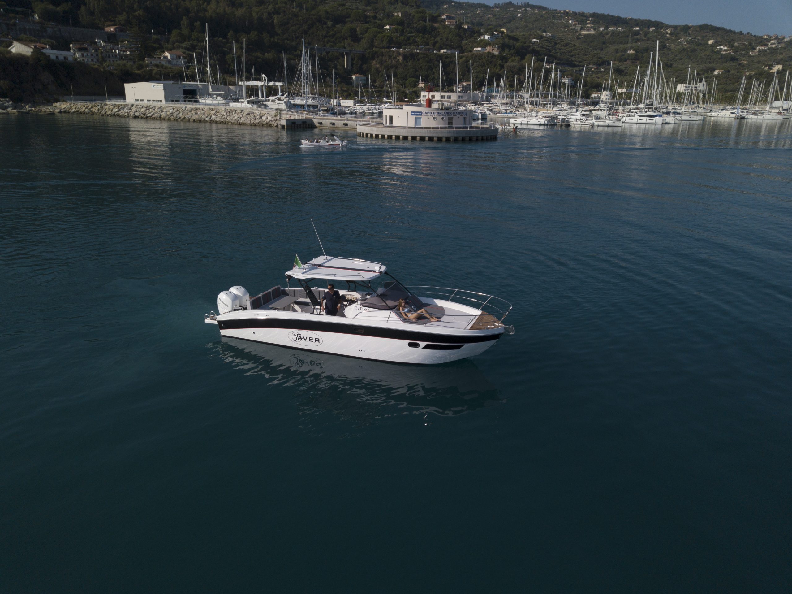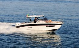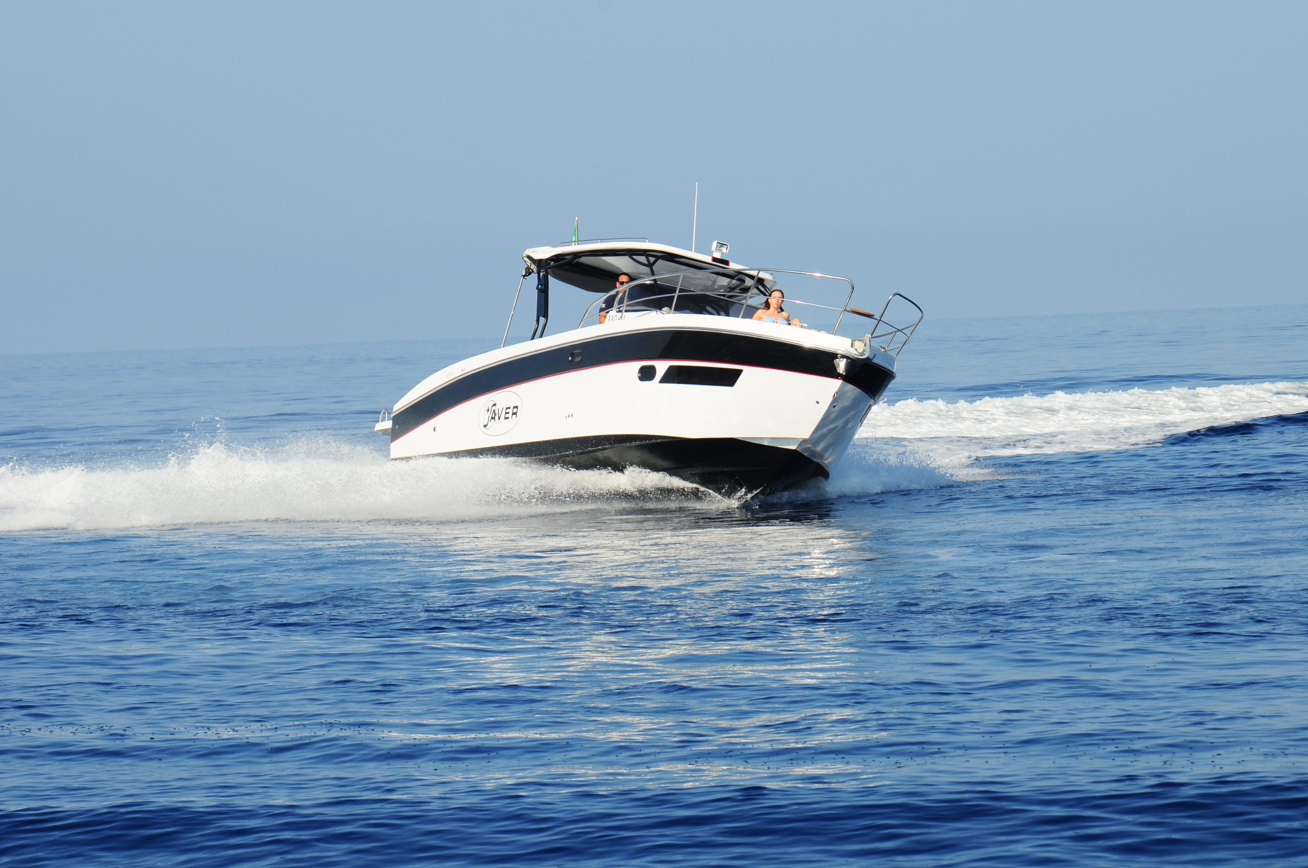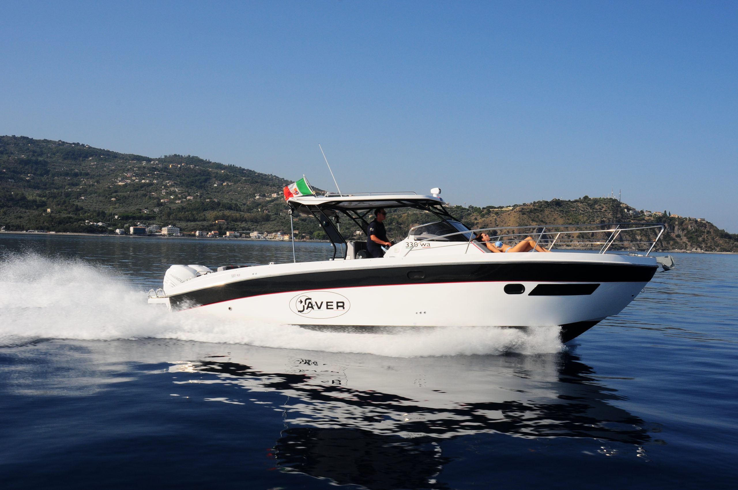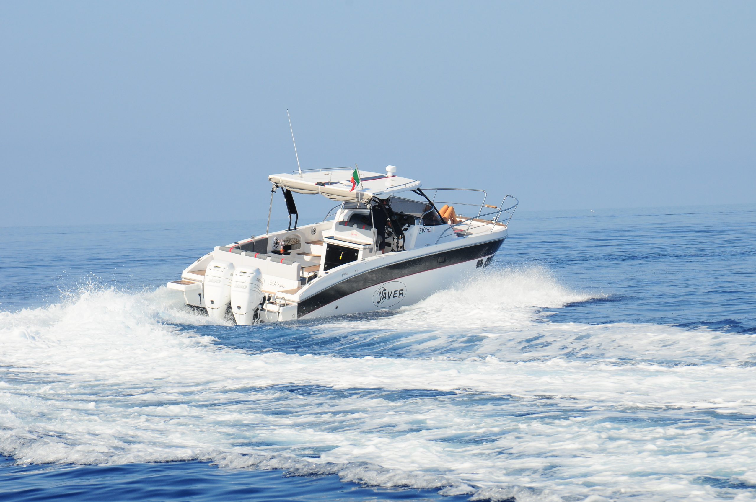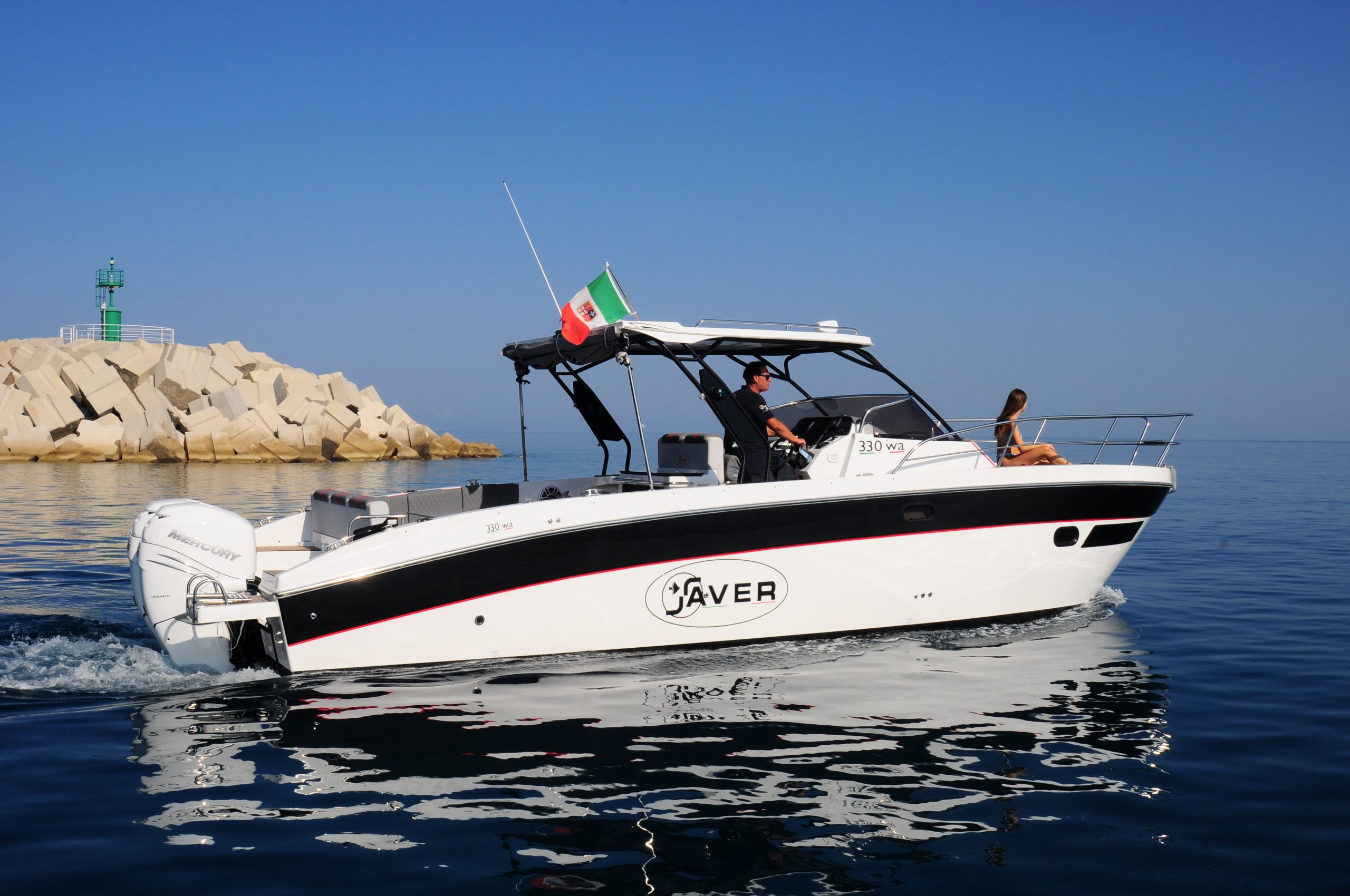 Our flagship model of the WA (Walk Around) series. A completely new hull design for this vessel, offering high-performance capabilities, both in terms of speed achievable with the maximum installed power, namely a pair of 400 horsepower outboard engines each, and the comfort of navigation even in rough waters. This flagship, weighing just over 4.5 tons without engines, like all WA versions, provides ample outdoor spaces for daytime activities, with a large cockpit equipped with a sink, storage compartments underneath, and the option to add an additional refrigerator apart from the one in the cabin and a second cooktop. The aft section features an ‘L’-shaped sofa with modern backrests and a table that, by simply replacing the supports, quickly converts the dining area or lounge into a secondary sunbed. The bow, on the other hand, offers a spacious fixed sunbed with chaise longue-style backrests. The console is proportionate to the size of the hull and provides space for the most modern and comprehensive onboard instrumentation. The entire area can be covered by a rigid T-Top, equipped with LED lights (including colored lights), providing protection for the pilot and co-pilot. A unique two-seater bench, with a raised seat for stand-up driving, is provided for the driver. However, it is internally where the 330 WA holds the greatest surprises, with a significant cabin height, a spacious forward berth/dinette, and a second bed for guests towards the stern. The primary galley area includes a fridge, Corian countertop, sink, two burners, and a standard microwave oven. The separate toilet compartment is also innovative, featuring a sliding door (less obtrusive) and separate WC and sink compartments divided by an internal door. This hull can easily reach speeds exceeding 40 knots with just 700 horsepower at the stern instead of the maximum 800 horsepower installation. A WA that will accompany you on your excursions as well as short or long cruises with complete autonomy and the utmost comfort for you and your guests.